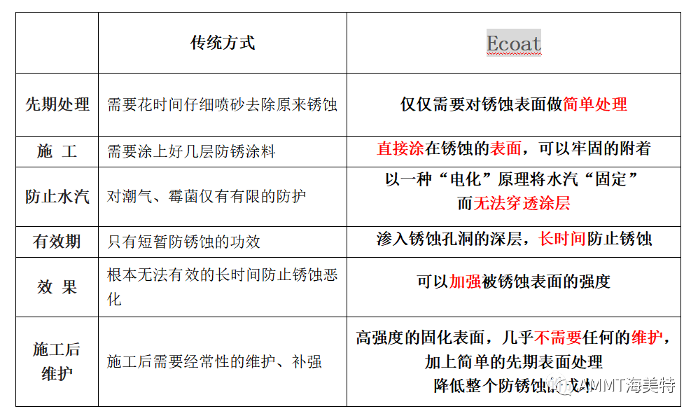 銹蝕對于許多必須讓設備曝露在極端的氣候及高濕度環境中的工業及產業,是個巨大的挑戰。一旦使用Ecoat ,可以讓銹蝕情況不再繼續。在涂上Ecoat后一小時內,它就開始結合空氣中的水汽而固化,同時滲入因銹蝕所產生的微小細孔中,膨脹、 硬化、密封。這個過程把表面,包括銹蝕部分完全密封,讓外面的水汽、空氣還有一些礦物成分沒有任何機會再度接觸到表面,繼續銹蝕。
