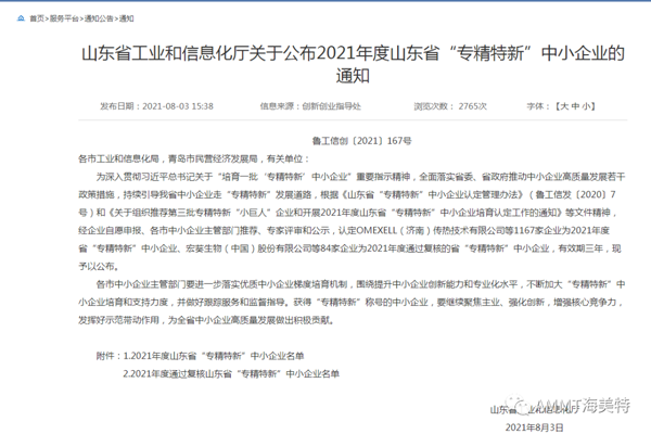 2021年8月,青島海洋新材料科技有限公司(AMMT海美特)獲批2021年度山東省“專精特新”中小企業(yè)榮譽稱號!
