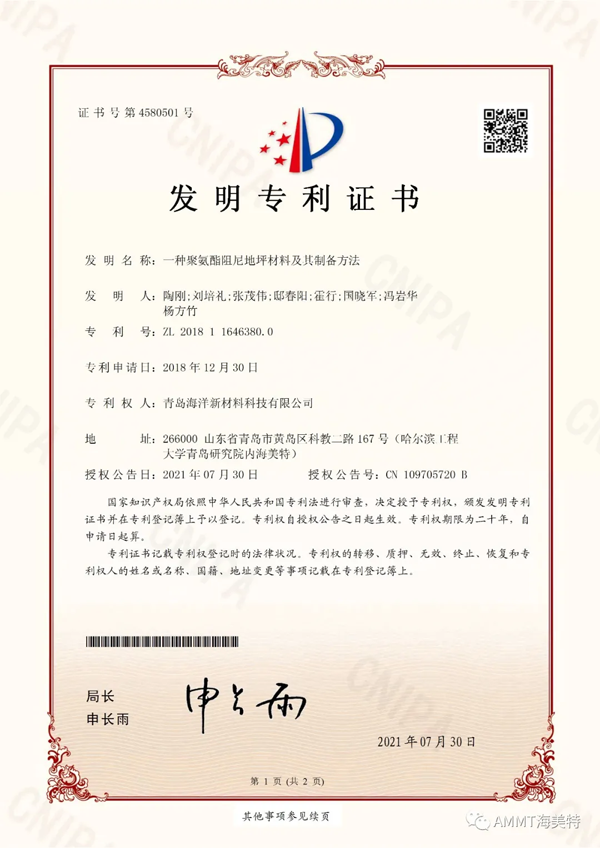 2021年7月30日,青島海洋新材料科技有限公司申請的《一種聚氨酯阻尼地坪材料及其制備方法》發明專利獲得國家知識產權局授權,授權專利號:ZL 2018 1 1646380.0。目前,公司共獲得國家授權專利33項,其中發明專利31項,實用新型專利1項,外觀設計專利1項。